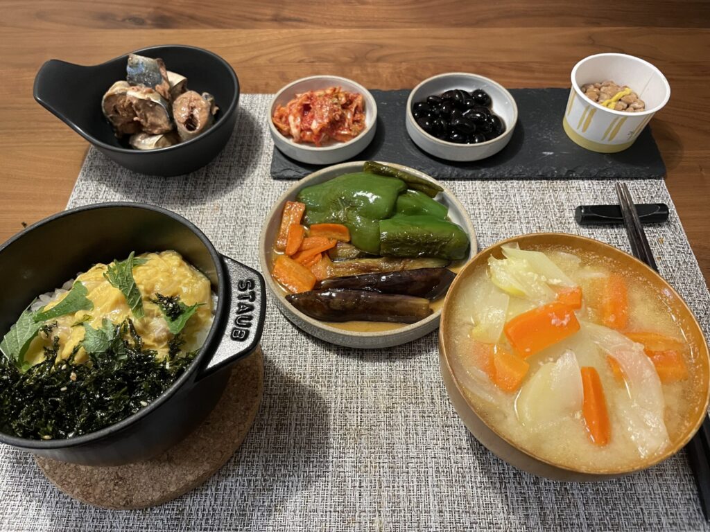 親子丼・豚汁・野菜の焼き浸し・サバ缶