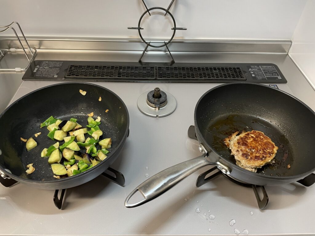 ナスとピーマンと冷凍ハンバーグを使います