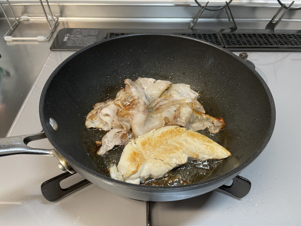 フライパンで肉を炒め始めました