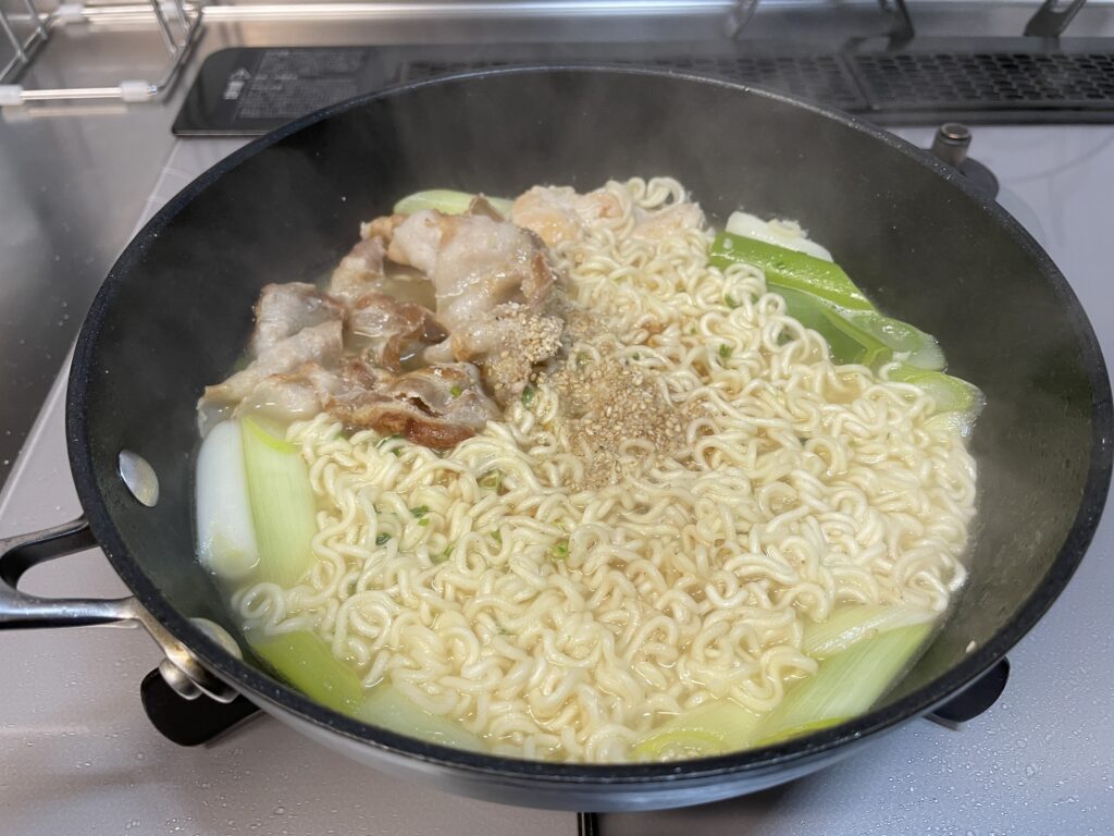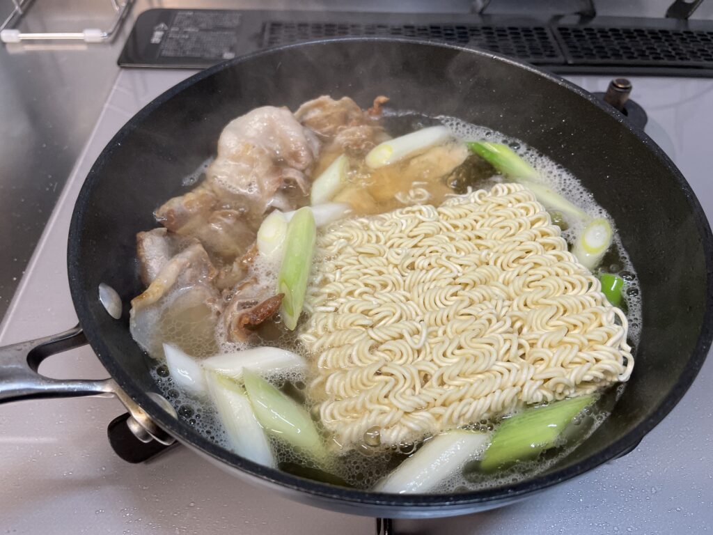 沸いたフライパンに麺を投入!