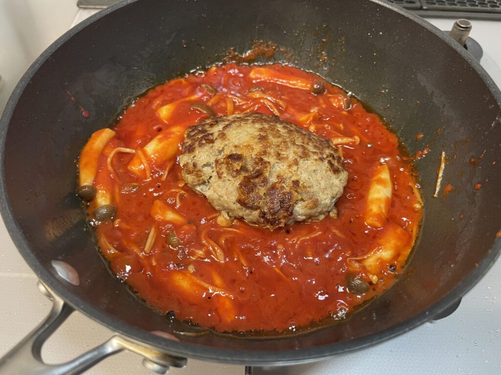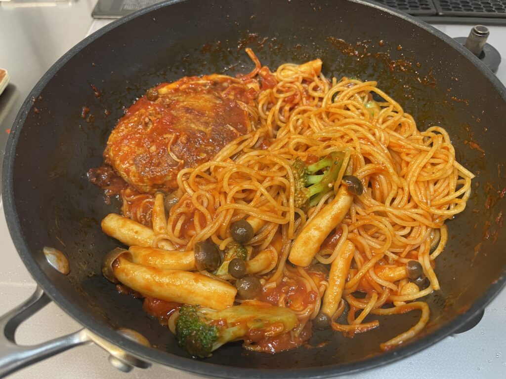 ハンバーグとパスタを絡めます
